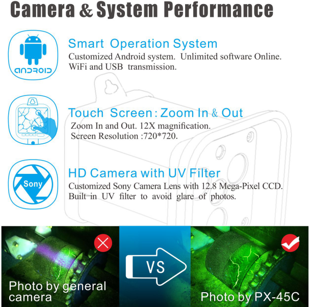 PHOENIX (PX) Series UV LED lamp with Camera is a hand-held UV LED Lamp with white light and UV light emissions. This type of lamps all can be equipped with black light filters. PHOENIX boasts for its HD Camera with 12.0 Million Pixel and is a good mate to take photos or videos for the cracks. The operation system of PHOENIX is Android 4.4 and the data can be transmitted via Built-in Wi-Fi or Micro-USB connnector.